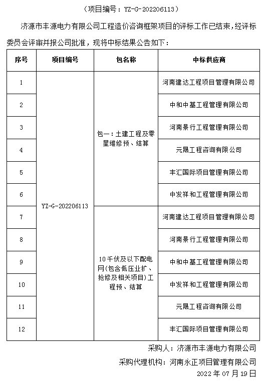 济源市丰源电力有限公司工程造价咨询框架项目中标结果公告