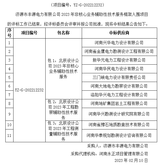 济源市丰源电力有限公司2023年非核心业务辅助性技术服务框架入围项目中标结果公告