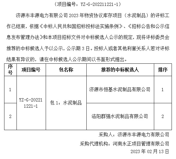 济源市丰源电力有限公司2023年物资协议库存项目(水泥制品)中标候选人公示