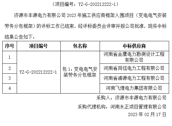 济源市丰源电力有限公司2023年施工供应商框架入围项目(变电电气安装劳务分包框架)中标结果公告
