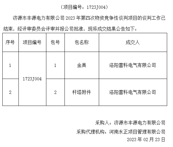 济源市丰源电力有限公司2023年第四次物资竞争性谈判项目成交结果公告