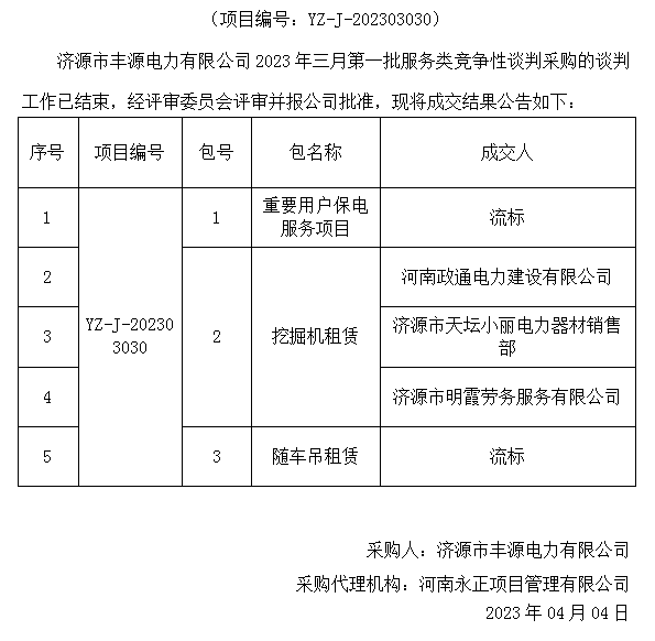 济源市丰源电力有限公司2023年三月第二批服务类竞争性谈判采购成交结果公告