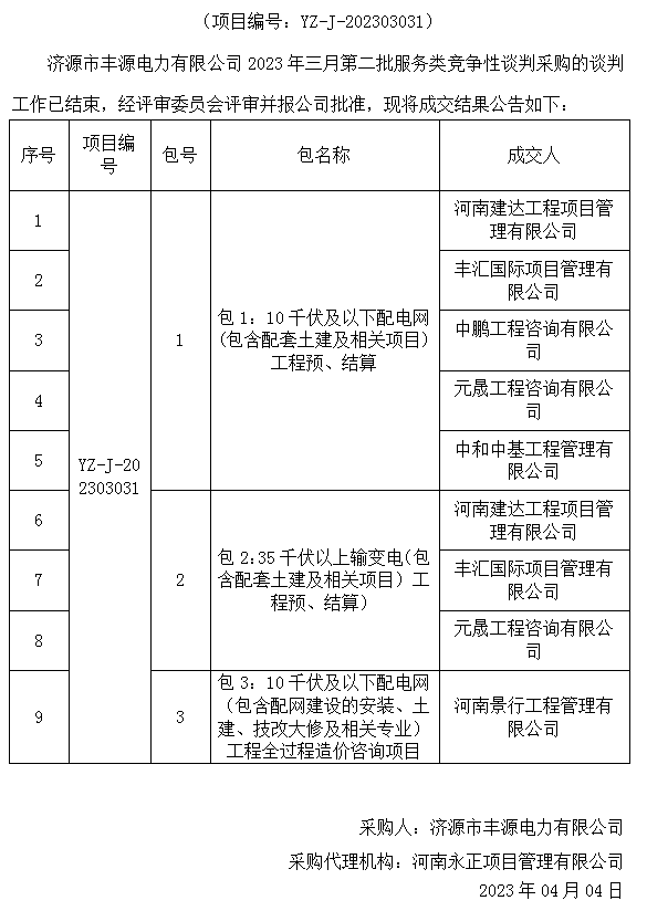济源市丰源电力有限公司2023年三月第一批服务类竞争性谈判采购成交结果公告