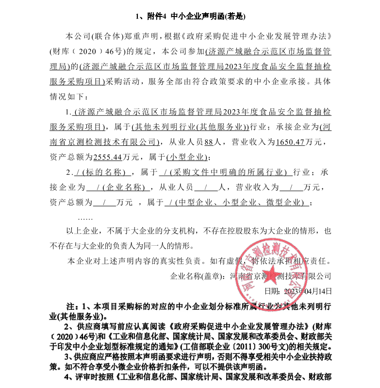 2、采购项目名称:济源产城融合示范区市场监督管理局2023年度食品安全监督抽检服务采购项目(包一:2023年济源示范区食品安全常规监督抽检)