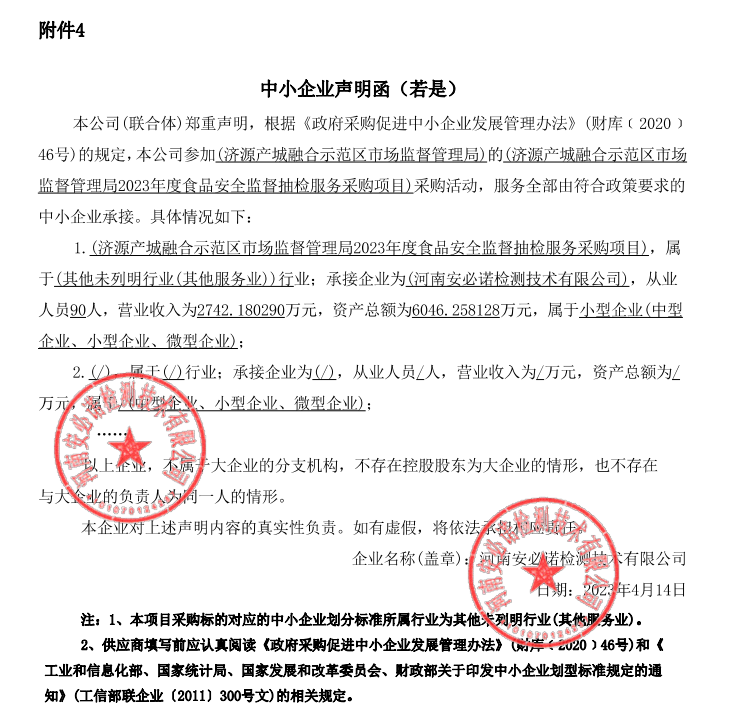 济源产城融合示范区市场监督管理局2023年度食品安全监督抽检服务采购项目(包二:2023年济源示范区食品安全专项抽检)成交结果公告