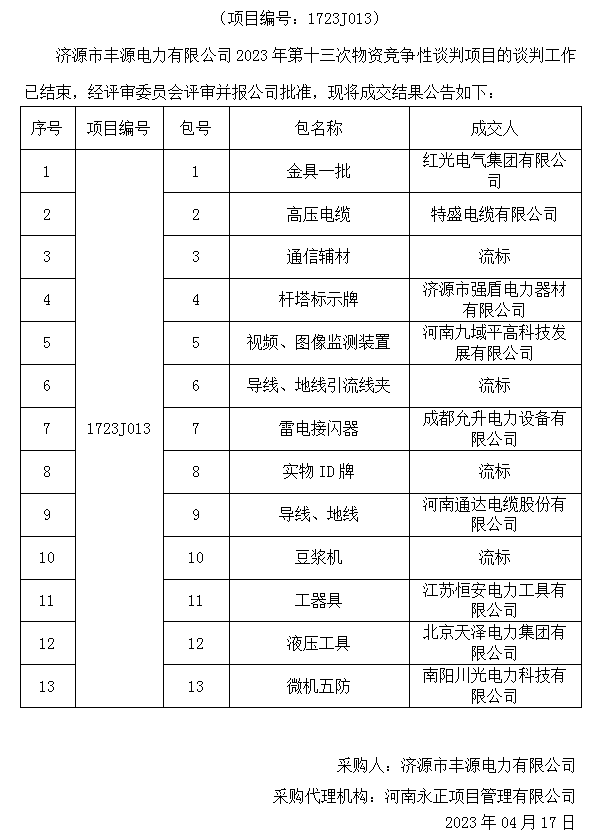 济源市丰源电力有限公司2023年第十三次物资竞争性谈判项目成交结果公告