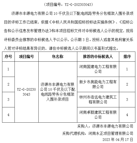 济源市丰源电力有限公司10千伏及以下配电线路劳务分包框架入围补录项目中标候选人公示