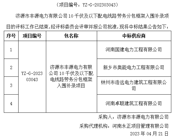 济源市丰源电力有限公司10千伏及以下配电线路劳务分包框架入围补录项目中标结果公告