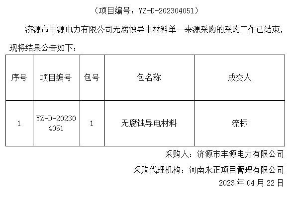 济源市丰源电力有限公司无腐蚀导电材料单一来源采购废标公告