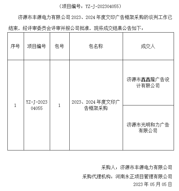 济源市丰源电力有限公司2023、2024年度文印广告框架采购成交结果公告