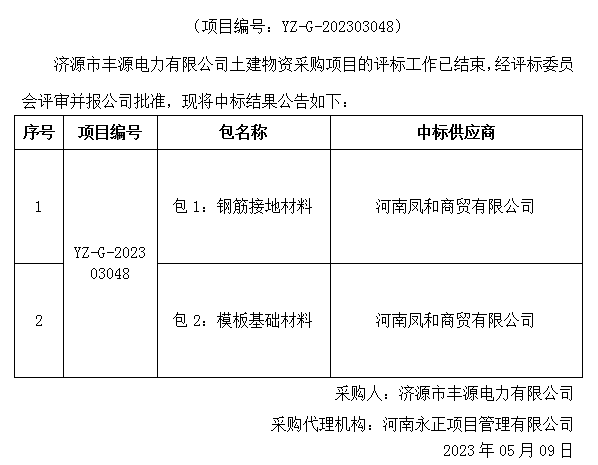 济源市丰源电力有限公司土建物资采购项目中标结果公告