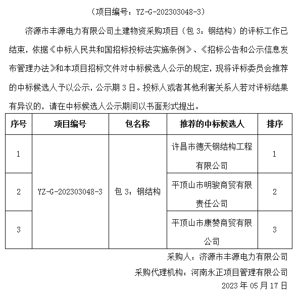 济源市丰源电力有限公司土建物资采购项目(包3:钢结构)中标候选人公示