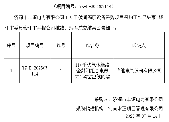 济源市丰源电力有限公司110千伏气体绝缘全封闭组合电气GIS采购项目成交结果公告