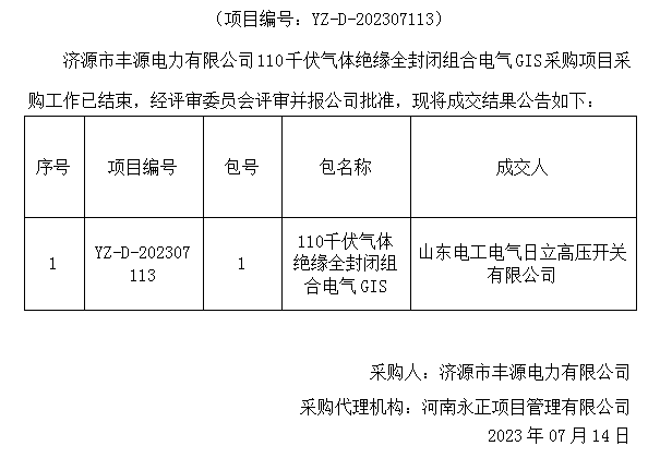 济源市丰源电力有限公司110千伏气体绝缘全封闭组合电气GIS采购项目成交结果公告